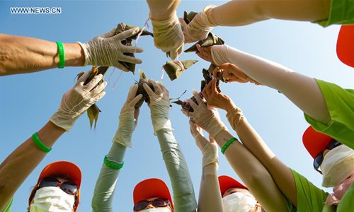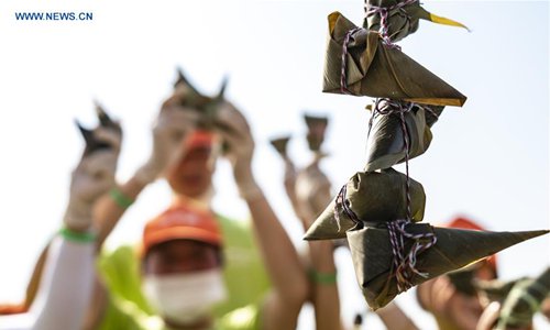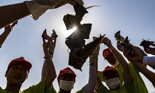 People show the Zongzi they made, which are pyramid-shaped dumplings made of glutinous rice wrapped in bamboo or reed leaves, during a Zongzi-making activity held at the scenic area of Qu Yuan's hometown in Zigui County, central China's Hubei Province, June 3, 2019. Over 9,000 people took part in the Zongzi making activity Monday to greet the upcoming Dragon Boat Festival, or Duanwu, which falls on May 5 of Chinese lunar calendar. The Duanwu festival is celebrated across China with various activities such as Zongzi making and dragon boat races to commemorate Qu Yuan (340 B.C.-278 B.C.), a poet of the Warring States Period (475 B.C.-221 B.C.) of ancient China, who lived in Zigui. This year's Duanwu falls on June 7. (Photo: Xinhua)