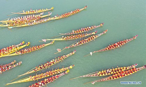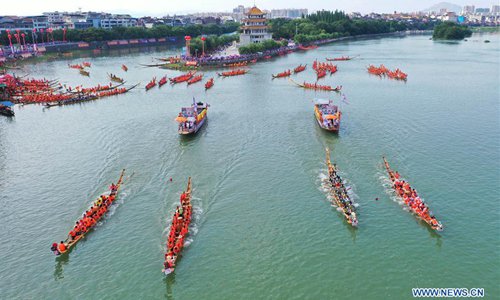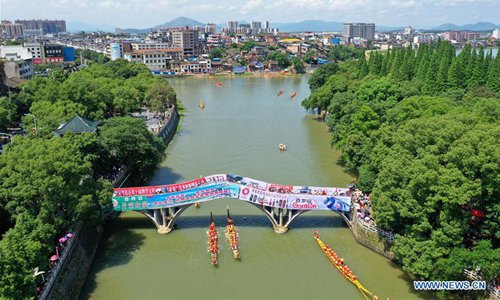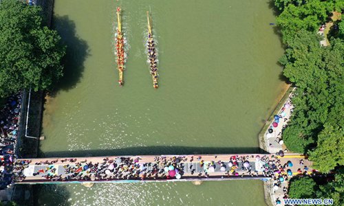Aerial photo taken on June 3, 2019 shows people participating in a dragon boat race held on Xiaoshui River in Daoxian County, central China's Hunan Province. A total of 144 boats took part in the race to celebrate the upcoming Dragon Boat Festival, which falls on June 7 this year.(Photo: Xinhua)