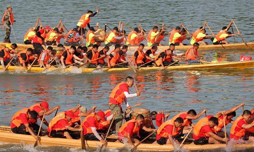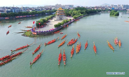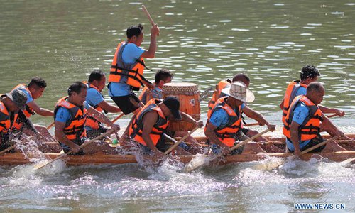 People participate in a dragon boat race held on Xiaoshui River in Daoxian County, central China's Hunan Province, June 3, 2019. A total of 144 boats took part in the race to celebrate the upcoming Dragon Boat Festival, which falls on June 7 this year. (Photo: Xinhua)