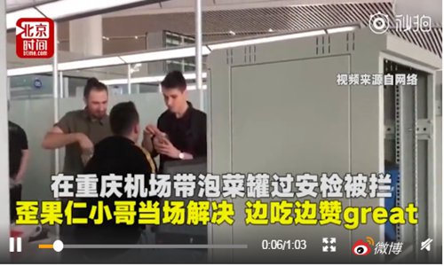 Three young foreign travelers devour pickled peppers prior to passing the security check at the airport in Southwest China's Chongqing Municipality. Photo: Screenshot of Btime Video
