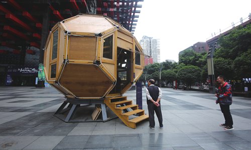 A man checks the inside of a two-story reading booth on a street near the entrance of the Guotai Art Center in Southwest China's Chongqing Municipality, on Tuesday. The 25.8-square-meter space capsule-like booth will provide some 60 books for free to city residents. Photo: VCG