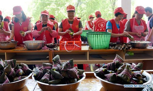 Volunteers make Zongzi, a traditional Chinese food made of glutinous rice wrapped in bamboo leaves, as festival gifts for the aged and sanitation workers in Xianju County of Taizhou, east China's Zhejiang Province, June 5, 2019. People across the country make various kinds of Zongzi to celebrate the upcoming Dragon Boat Festival, which falls on June 7 this year. (Xinhua/Wang Huabin)