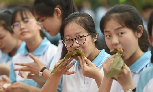 Students taste Zongzi, a traditional Chinese food made of glutinous rice wrapped in bamboo leaves, at an experimental middle school in Yuqing County of Zunyi, southwest China's Guizhou Province, June 5, 2019. People across the country make various kinds of Zongzi to celebrate the upcoming Dragon Boat Festival, which falls on June 7 this year. (Xinhua/He Chunyu)