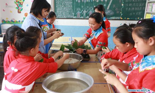 Children learn to make Zongzi, a traditional Chinese food made of glutinous rice wrapped in bamboo leaves, under teachers' guidance at Shibanqiao Primary School in Qianxi County of Bijie City, southwest China's Guizhou Province, June 5, 2019. People across the country make various kinds of Zongzi to celebrate the upcoming Dragon Boat Festival, which falls on June 7 this year. (Xinhua/Zhou Xunchao)
