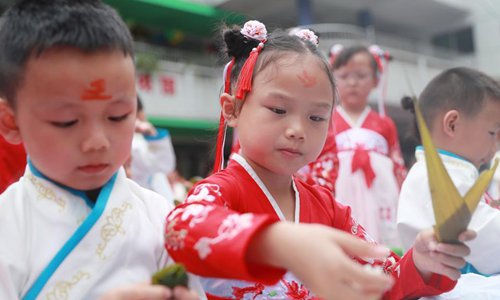 Children learn to make Zongzi, a traditional Chinese food made of glutinous rice wrapped in bamboo leaves, at Huaying Experimental Kindergarten in Huaying City, southwest China's Sichuan Province, June 5, 2019. People across the country make various kinds of Zongzi to celebrate the upcoming Dragon Boat Festival, which falls on June 7 this year. (Xinhua/Qiu Haiying)