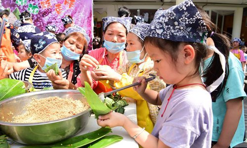 Children learn to make Zongzi, a traditional Chinese food made of glutinous rice wrapped in bamboo leaves, under guidance of teachers and parents at a kindergarten in Jiande City, east China's Zhejiang Province, June 5, 2019. People across the country make various kinds of Zongzi to celebrate the upcoming Dragon Boat Festival, which falls on June 7 this year. (Xinhua/Ning Wenwu)