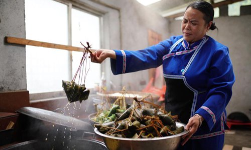 A woman of the Yao ethnic group takes out boiled Zongzi, a traditional Chinese food made of glutinous rice wrapped in bamboo leaves, at Xinzhai Village in Longsheng, south China's Guangxi Zhuang Autonomous Region, June 5, 2019. People across the country make various kinds of Zongzi to celebrate the upcoming Dragon Boat Festival, which falls on June 7 this year. (Xinhua/Huang Yongdan)