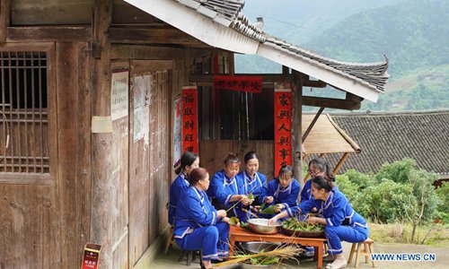Women of the Yao ethnic group make Zongzi, a traditional Chinese food made of glutinous rice wrapped in bamboo leaves, at Xinzhai Village in Longsheng, south China's Guangxi Zhuang Autonomous Region, June 5, 2019. People across the country make various kinds of Zongzi to celebrate the upcoming Dragon Boat Festival, which falls on June 7 this year. (Xinhua/Huang Yongdan)