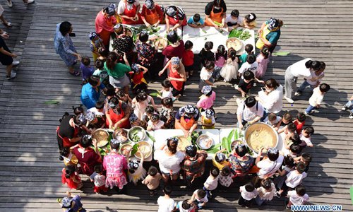 Children learn to make Zongzi, a traditional Chinese food made of glutinous rice wrapped in bamboo leaves, under teachers' guidance at a kindergarten in Jiande City, east China's Zhejiang Province, June 5, 2019. People across the country make various kinds of Zongzi to celebrate the upcoming Dragon Boat Festival, which falls on June 7 this year. (Xinhua/Ning Wenwu)