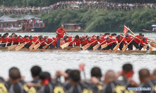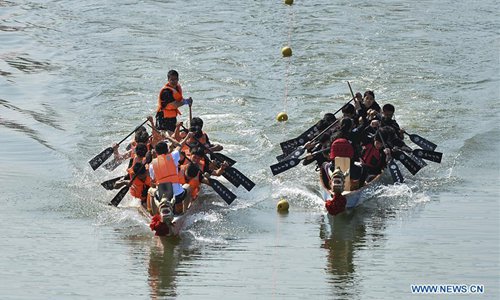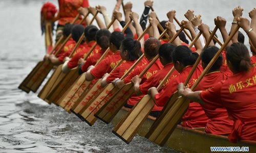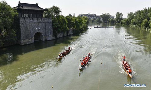 People take part in a dragon boat race to celebrate the Dragon Boat Festival in the Taierzhuang ancient town in Zaozhuang, east China's Shandong Province, June 7, 2019. Various activities are held to celebrate the Dragon Boat Festival, or Duanwu, which falls on June 7 this year. Photo: Xinhua