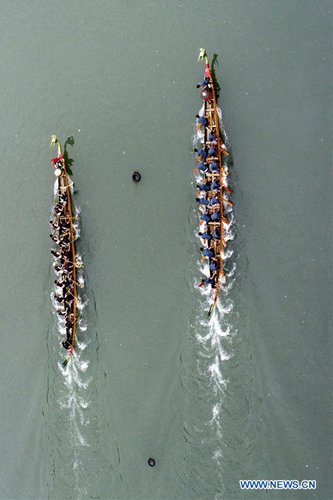People take part in a dragon boat race to celebrate the Dragon Boat Festival on the Jinjiang River in Tongren City, southwest China's Guizhou Province, June 7, 2019. Various activities are held to celebrate the Dragon Boat Festival, or Duanwu, which falls on June 7 this year. Photo: Xinhua