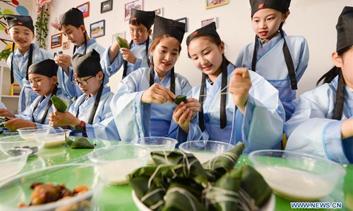 Students and their teacher make Zongzi, a traditional Chinese food made of glutinous rice wrapped in bamboo leaves, in Linzhang County, Handan City, north China's Hebei Province, June 7, 2019. Various activities are held to celebrate the Dragon Boat Festival, or Duanwu, which falls on June 7 this year. Photo: Xinhua