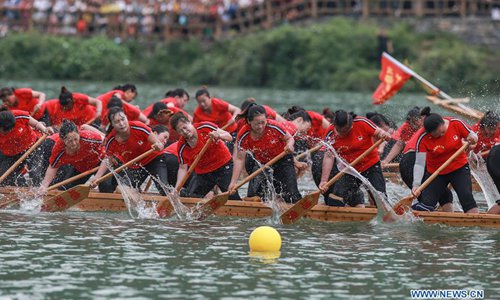 People take part in a dragon boat race to celebrate the Dragon Boat Festival on the Qingshui River in Biancheng Township, Huayuan County, central China's Hunan Province, June 7, 2019. Various activities are held to celebrate the Dragon Boat Festival, or Duanwu, which falls on June 7 this year. Photo: Xinhua