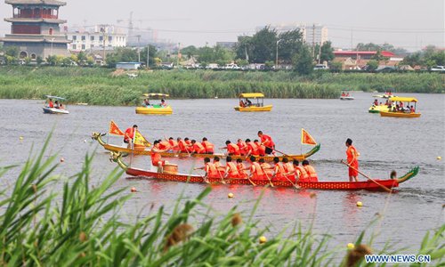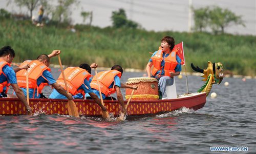 People take part in a dragon boat race to celebrate the Dragon Boat Festival in Shengfang Township, Bazhou City, north China's Hebei Province, June 7, 2019. Various activities are held to celebrate the Dragon Boat Festival, or Duanwu, which falls on June 7 this year. Photo: Xinhua