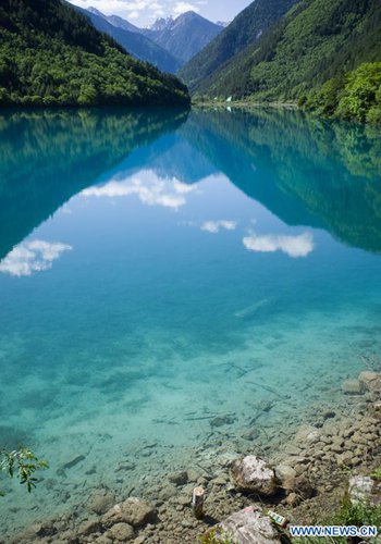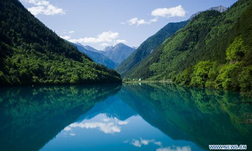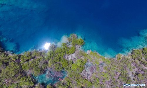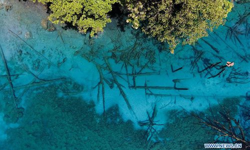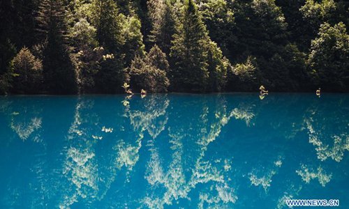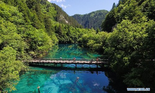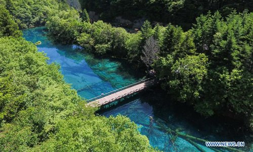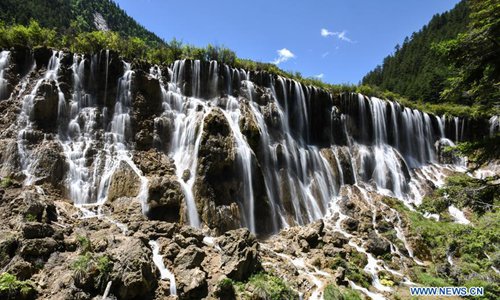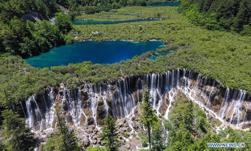 Aerial photo shows the scenery of the Nuorilang Waterfall in the Jiuzhaigou National Park in southwest China's Sichuan Province, June 5, 2019. Due to damages caused by the magnitude-7.0 earthquake that hit here on Aug. 8, 2017, the park has been temporarily closed since July 2018 for renovation. Photo: Xinhua