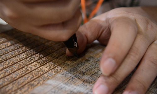 Photo taken on June 8, 2019 shows a woodblock printing demonstration on the Cultural and Natural Heritage Day at an exhibition center in Guangzhou, capital of south China's Guangdong Province. More than 3,200 activities have been staged across China to celebrate this year's Cultural and Natural Heritage Day, which falls on the second Saturday of every June. (Xinhua/Xu Jianmei)