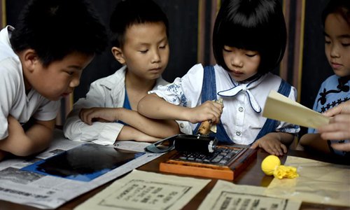 Children try movable-type printing on the Cultural and Natural Heritage Day at Taining County, southeast China's Fujian Province, June 8, 2019. More than 3,200 activities have been staged across China to celebrate this year's Cultural and Natural Heritage Day, which falls on the second Saturday of every June. (Xinhua/Qiu Canwang)
