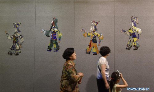 People view a shadow puppets exhibition on the Cultural and Natural Heritage Day at a museum in Houma City, north China's Shanxi Province, June 8, 2019. More than 3,200 activities have been staged across China to celebrate this year's Cultural and Natural Heritage Day, which falls on the second Saturday of every June. (Xinhua/Qiao Jinchun)