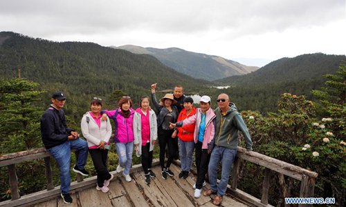 Tourists pose for photos at the 99 Dragon Pools scenic spot of Laojun Mountain National Park in Lijiang, southwest China's Yunnan Province, June 8, 2019. (Xinhua/Qin Qing)