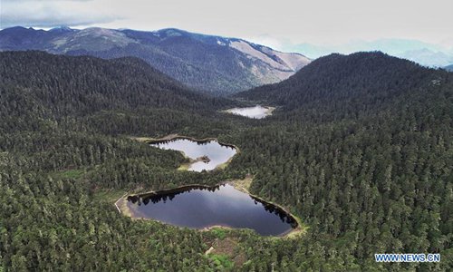 Aerial photo taken on June 8, 2019 shows the 99 Dragon Pools scenic spot of Laojun Mountain National Park in Lijiang, southwest China's Yunnan Province. (Xinhua/Qin Qing)