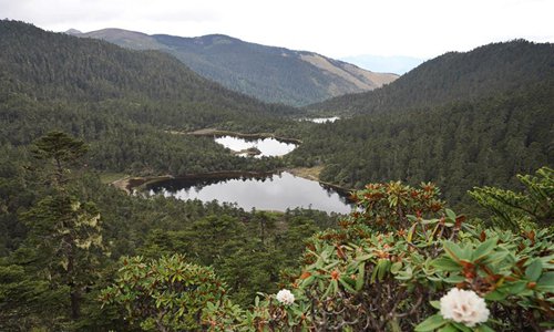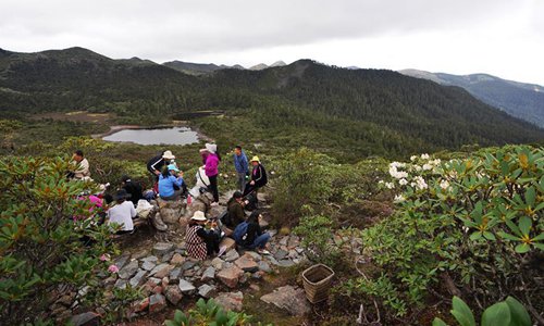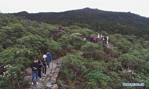 Aerial photo taken on June 8, 2019 shows tourists viewing azalea blossoms at the 99 Dragon Pools scenic spot of Laojun Mountain National Park in Lijiang, southwest China's Yunnan Province. (Xinhua/Qin Qing)