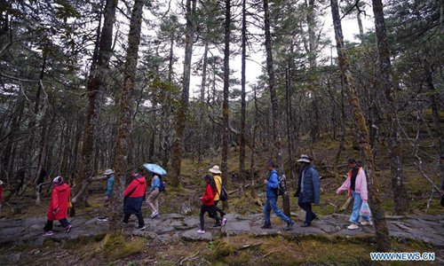 Tourists view the scenery of 99 Dragon Pools scenic spot of Laojun Mountain National Park in Lijiang, southwest China's Yunnan Province, June 8, 2019. (Xinhua/Qin Qing)
