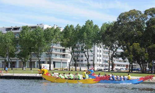 People participate in a dragon boat race to celebrate the Chinese Dragon Boat Festival at the Confucius Institute of Aveiro University in Aveiro, Portugal, June 8, 2019. A series of activities were conducted on Saturday in Aveiro to celebrate the traditional Chinese festival. (Xinhua/Wen Xinnian)