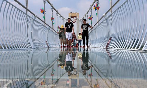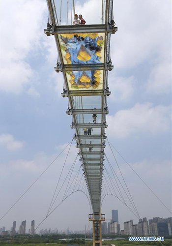 Tourists walk on a glass-bottomed bridge at a scenic area of Nantong, east China's Jiangsu Province, June 8, 2019. (Xinhua/Xu Congjun)