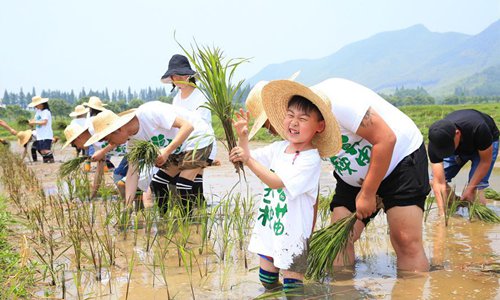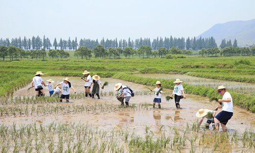 Tourists from Hangzhou experience rice seedling planting in Laoling Village of Moganshan Township in Deqing County, east China's Zhejiang Province, June 8, 2019. (Xinhua/Yao Haixiang)