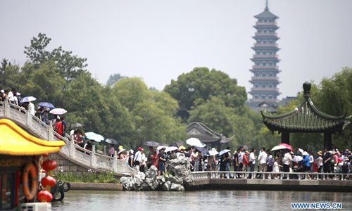 People visit the Slender West Lake in Yangzhou, east China's Jiangsu Province, June 8, 2019. (Xinhua/Meng Delong)