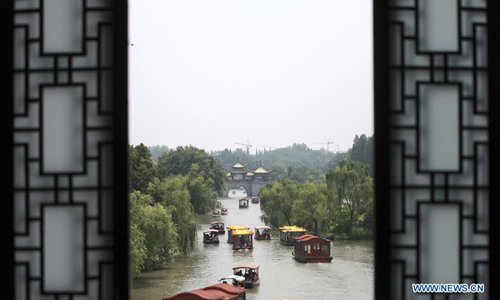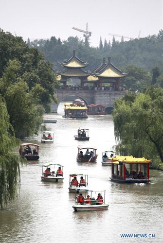 Tourists enjoy boat ride on the Slender West Lake in Yangzhou, east China's Jiangsu Province, June 8, 2019. (Xinhua/Meng Delong)