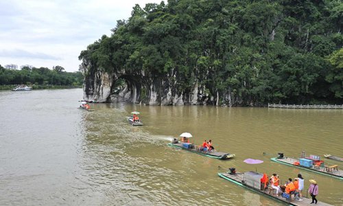 Aerial photo taken on June 8, 2019 shows tourists enjoying the scenery at the Elephant Trunk Hill tourism resort by bamboo rafts in Guilin, south China's Guangxi Zhuang Autonomous Region, June 8, 2019. (Xinhua/Huang Yongdan)