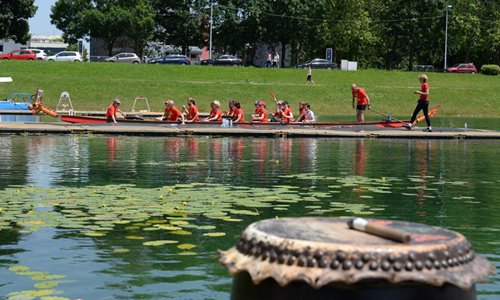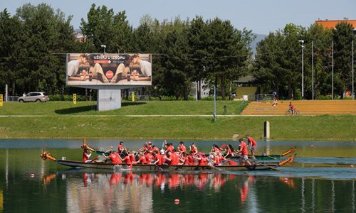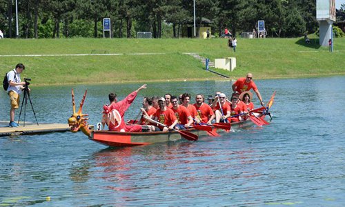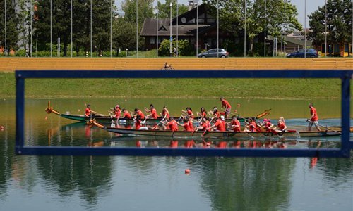 People participate in a dragon boat race to celebrate the Dragon Boat Festival on the Jarun Lake in Zagreb, Croatia, June 8, 2019. (Xinhua/Gao Lei)