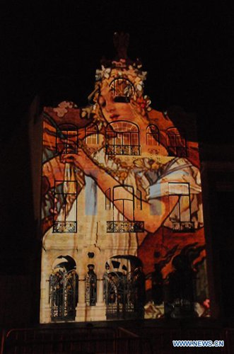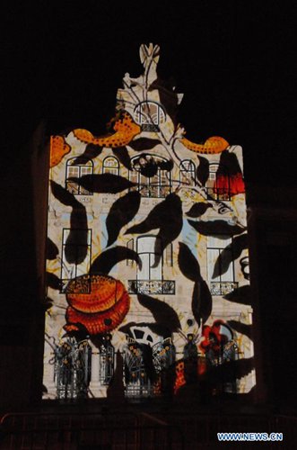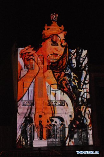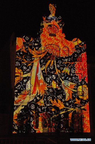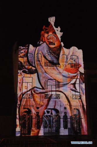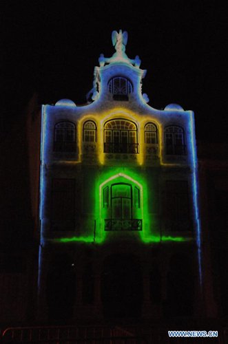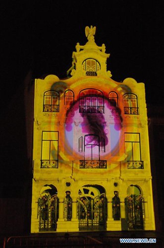 Photo taken on June 8, 2019 shows a light show projected on the building of Art Nouveau Museum in Aveiro, Portugal. A light show displaying scenes of Braganza Dynasty was presented in Aveiro on Saturday night. (Xinhua/Wen Xinnian)
