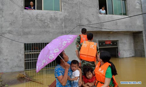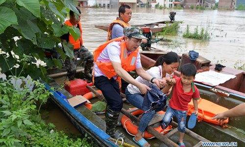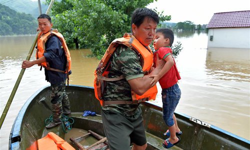 Rescuers transfer a child at the flooded Paixing Village of Zaizhong Township in Yongxin County, East China's Jiangxi Province, June 9, 2019. Heavy rainfall swept Jiangxi in the past two days. In Paixing, 116 stranded people have been rescued and relocated to safe places. (Photo: Xinhua)