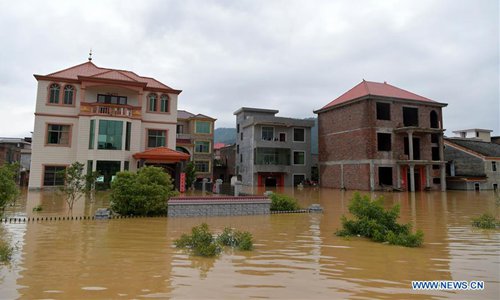 Photo shows the waterlogged Paixing Village of Zaizhong Township in Yongxin County, East China's Jiangxi Province, June 9, 2019. Heavy rainfall swept Jiangxi in the past two days. In Paixing, 116 stranded people have been rescued and relocated to safe places. (Photo: Xinhua)