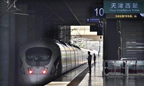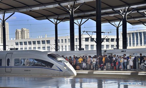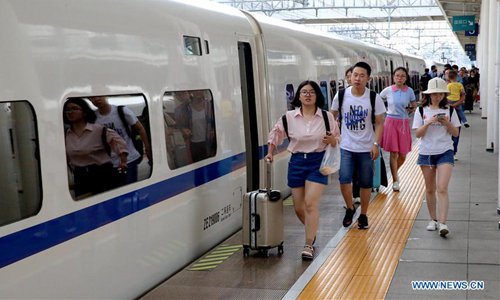 A bullet train daparts from Tianjin West Railway Station in north China's Tianjin, June 9, 2019. Sunday witnessed a travel rush as the Dragon Boat Festival holiday came to an end. (Photo: Xinhua)