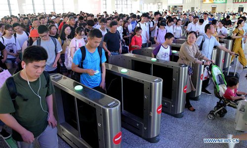 Passengers board trains at Qinhuangdao Railway Station in Qinhuangdao, north China's Hebei Province, June 9, 2019. Sunday witnessed a travel rush as the Dragon Boat Festival holiday came to an end. (Photo: Xinhua)