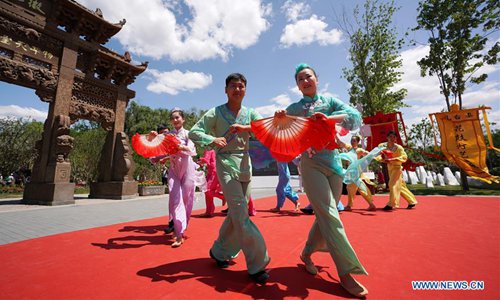 Actors perform Huagudeng, or flower-drum opera, at the entrance of Anhui Garden during the Beijing International Horticultural Exhibition in Yanqing District, Beijing, capital of China, June 9, 2019. Anhui Day theme event is held during the Beijing International Horticultural Exhibition from June 9 to 11. (Photo: Xinhua)