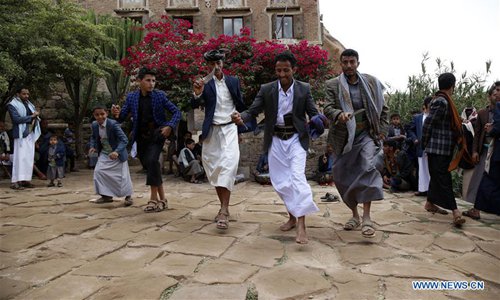 Yemenis perform traditional dance Barra during the holiday of Eid al-Fitr at the Dar Al-Hajar (Rock Palace), northwest of Sanaa, Yemen, on June 9, 2019. (Photo: Xinhua)