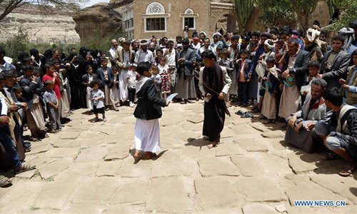 Yemeni children perform traditional dance Barra during the holiday of Eid al-Fitr at the Dar Al-Hajar (Rock Palace), northwest of Sanaa, Yemen, on June 9, 2019. (Photo: Xinhua)