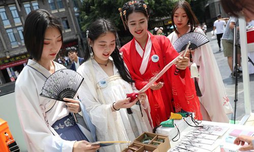 Hanfu lovers look at scented sachets and traditional books at the Wide and Narrow Alleys in Chengdu, Southwest China’s Sichuan Province. (Photo: Xinhua)