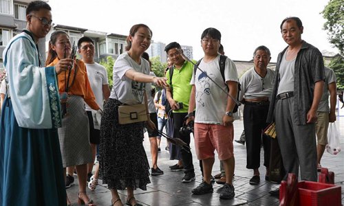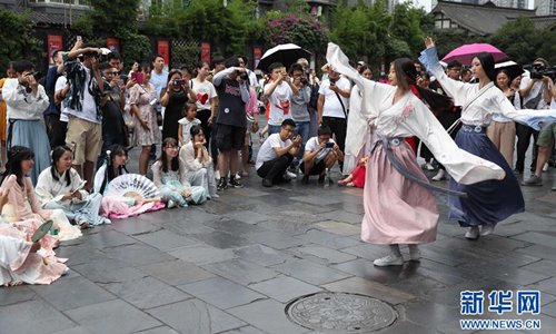 Photo taken on June 9, 2019 shows Hanfu (Chinese traditional costume) lovers perform traditional Chinese dances at Wide and Narrow Alleys in Chengdu, Southwest China’s Sichuan Province. (Photo: Xinhua)