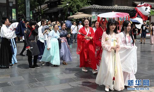 Photo taken on June 9, 2019, shows Hanfu (Chinese traditional costume) lovers parading across Wide and Narrow Alleys in Chengdu, Southwest China’s Sichuan Province. (Photo: Xinhua)