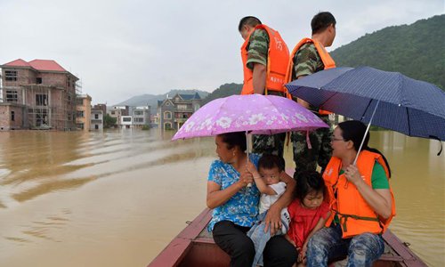 Since June 6, heavy rains have soaked the northeastern and middle part of Jiangxi, triggering severe flooding. As of Monday morning, 1.42 million people from 56 counties in nine cities, including Ji'an and Shangrao, had been impacted, according to a statement sent by the emergency management department of Jiangxi to the Global Times on Monday.