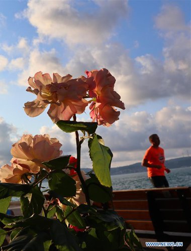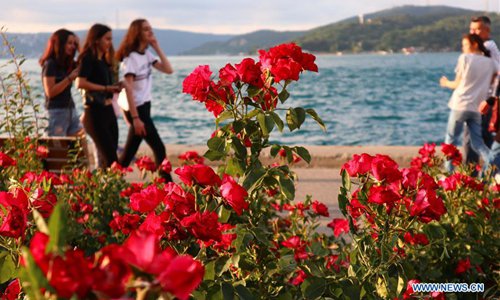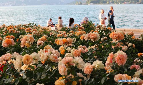 People enjoy their leisure beside China roses in Istanbul, Turkey, June 10, 2019. China roses planted in Istanbul are in full bloom in early summer. (Photo: Xinhua)