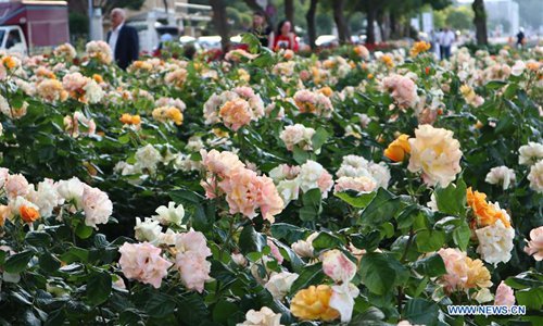 People walk past China roses in Istanbul, Turkey, June 10, 2019. China roses planted in Istanbul are in full bloom in early summer. (Photo: Xinhua)
