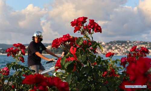 A cyclist stops to enjoy China roses in Istanbul, Turkey, June 10, 2019. China roses planted in Istanbul are in full bloom in early summer. (Photo: Xinhua)