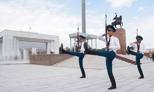 Honor guards are seen at the Ala Too Square in Bishkek, capital of Kyrgyzstan, on June 9, 2019. (Photo: Xinhua)