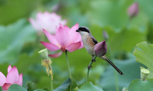 A bird perches on a lotus flower in Xiwan Village, Yongzhou City of central China's Hunan Province, June 9, 2019. (Photo: Xinhua)